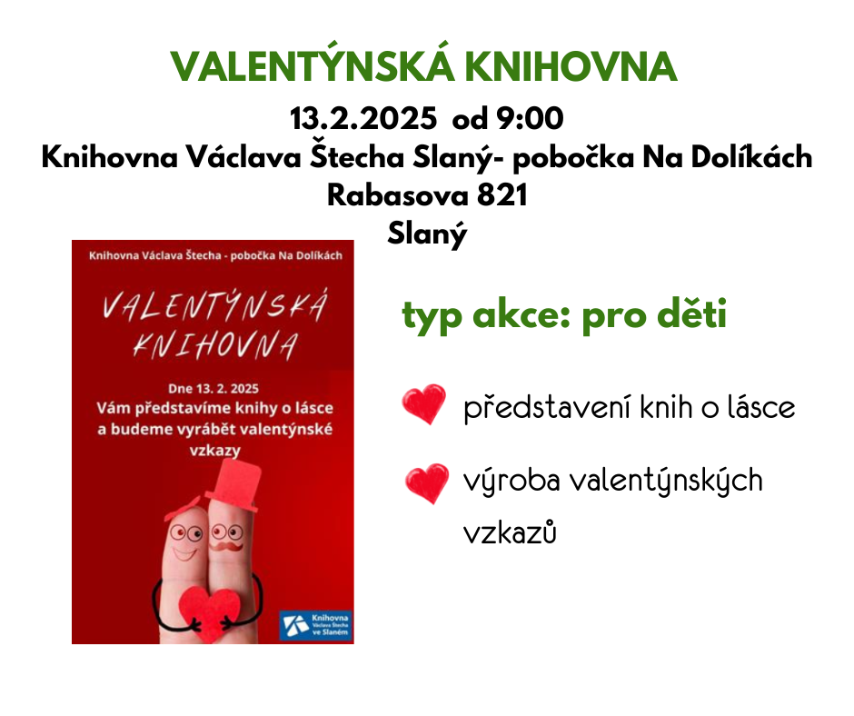 13.2.2025 od 9:00 pořádá knihovna Václava Štěcha – pobočka Na Dolíkách, valentýnskou akci pro naše nejmenší. Kdo nám pošle svou valentýnku? jsmetuprovas@kolpingsmecno.cz
