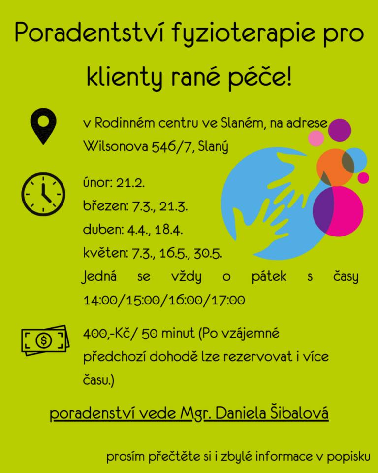Poradenství fyzioterapie ve Slaném! Poradenství bude probíhat s fyzioterapeutkou Mgr. Danielou Šibalovou, která s naší organizací již mnoho…