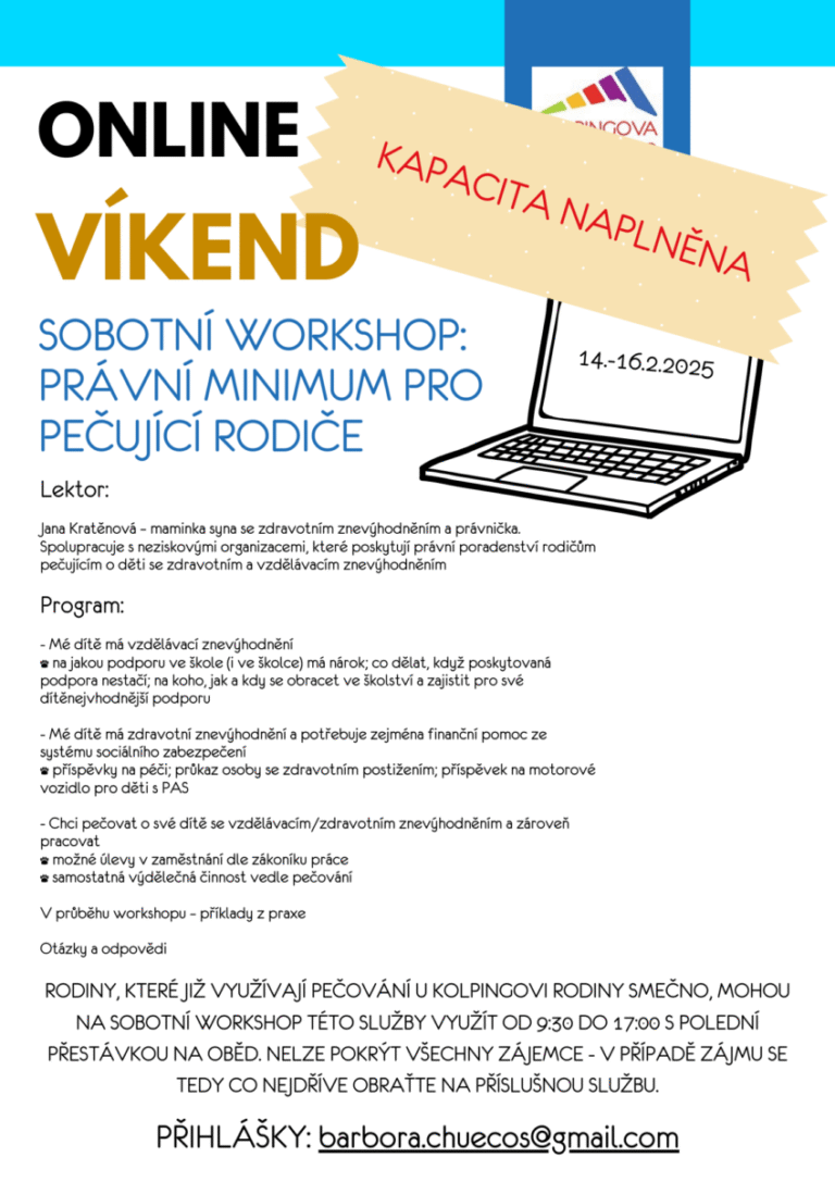 sobotní workshop: Právní minimum pro pečující rodiče Lektor: Jana Kratěnová – maminka syna se zdravotním znevýhodněním a právnička.…