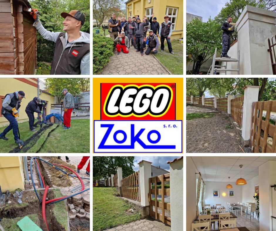 Za významné pomoci dobrovolníků firmy LEGO jsme mohli zkrášlit zahradu, opravit herní prvky pro děti, ale i natřít vstupní bránu, kamenné sloupky a celkově zahradu připravit na nepřetržitý provoz.